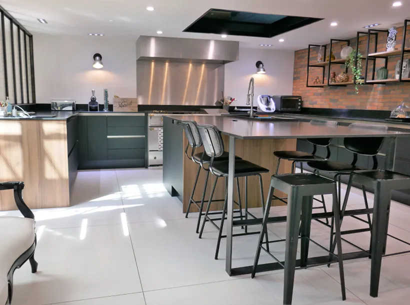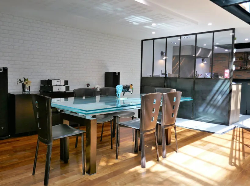 La superbe pièce de vie de 80 m² sous verrière bénéficie d’un patio végétalisé, prolongé par une vaste cuisine meublée et équipée de très belle qualité.