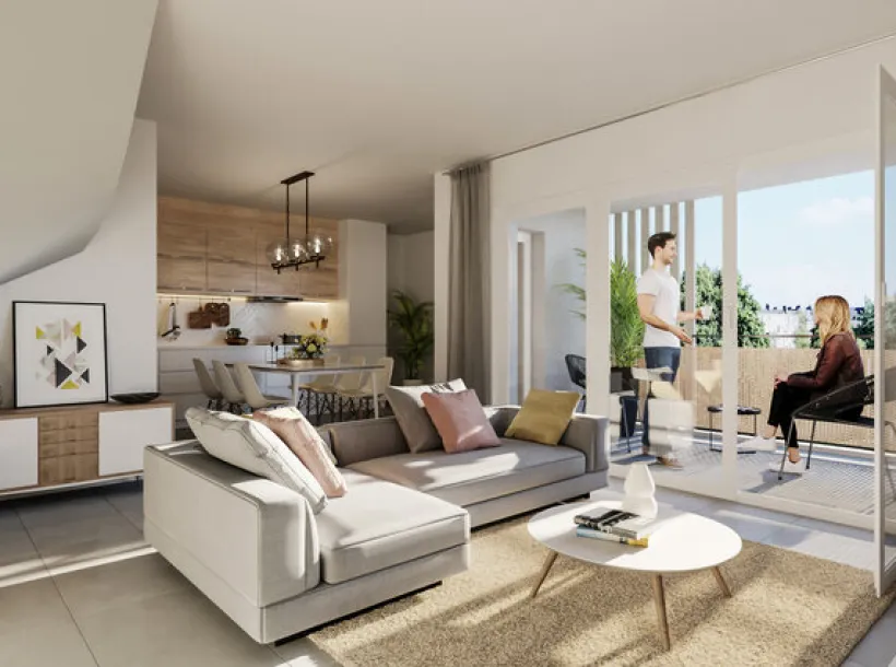 Appartement T3 de 59,54 m² avec une agréable terrasse de 15,4 m². Il se compose d'une entrée, d'une pièce de vie ouverte sur une cuisine équipée prolongée par l'extérieur. Vous profiterez également de deux chambres et d'une salle d'eau. Chauffage individuel électrique.