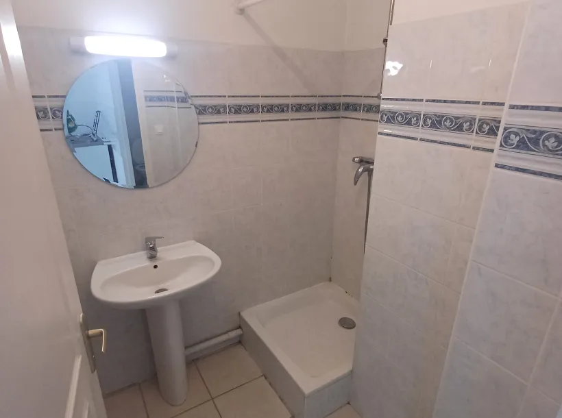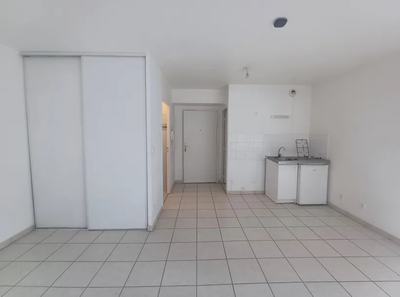 Studio non meublé de 23.75 m². Il se compose d'une pièce de vie ouverte sur une kitchenette équipée (évier, plaque de cuisson, frigo top), d'une salle d'eau (douche, meuble vasque, miroir) et WC séparés. Chauffage compris dans les charges.