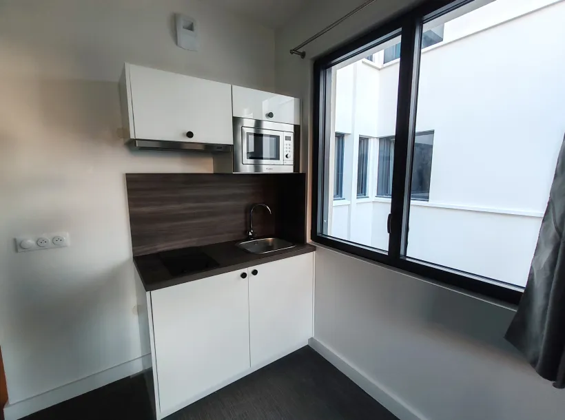 Studio de 27,47 m. Il se compose d'une entrée, d'une pièce de vie ouverte sur un coin cuisine équipé (évier, plaque de cuisson, hotte, meubles de rangement) et d'une salle d'eau (meuble vasque, miroir, douche, sèche serviettes, WC). Chauffage individuel électrique.
