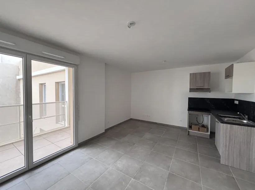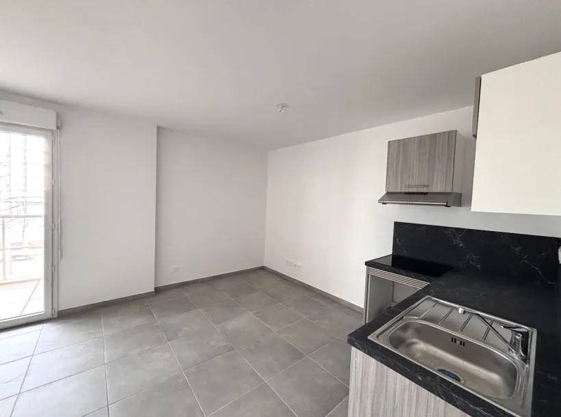 Appartement T1 neuf de 29.48 m² avec un balcon. Il se compose d'une entrée, d'une pièce de vie ouverte sur une cuisine équipée (évier, plaque de cuisson, hotte, meubles de rangement, plan de travail) et d'une salle d'eau (douche, meuble vasque, miroir, WC). Chauffage individuel électrique et eau chaude compris dans les charges.